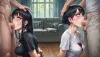 best quality, clean art, (2girls, 2men), goth college students with black hair, medium breasts, ripped t-shirt and miniskirts, hands bound behind back, (fucked by old men, forced to kiss, lesbian kissing), living room, crying, tears