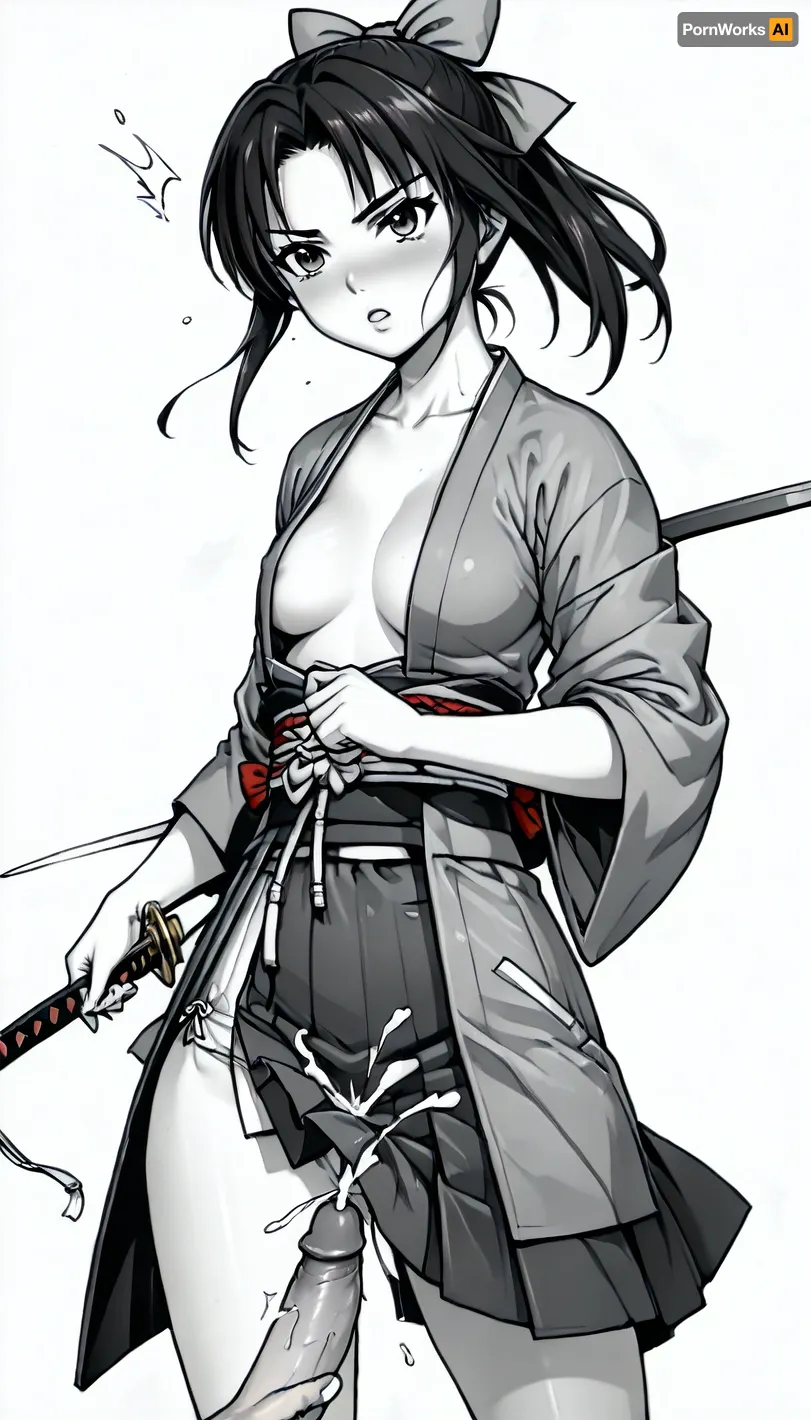 Bow, Japanese, kyudo, yumi, solo, skirt, girl, standing, monochrome, weapon, female focus, japanese clothes, open clothes, kimono, holding weapon, hakama, hakama skirt, (The female warrior rubs the penis with one hand to make it ejaculate, and holds the samurai sword with the other hand:1.6), kyuudou in the style of, Female, Samurai, Style, <lora:female samurai style v2:1.4>