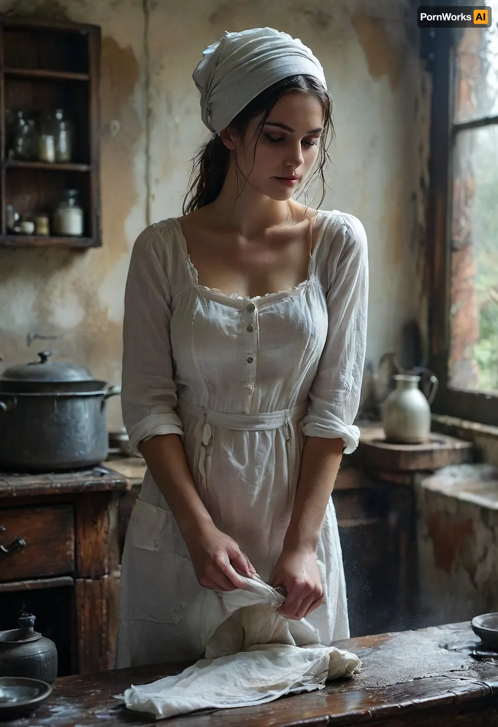 18. yüzyılda, genç 18 yaşındaki bir yalnız kız kale mutfağında yardımcı olarak çalışıyor. Uzun, basit bir pamuk elbise ve bir kafakarf giyindi, ultra tery ve yıprandı. Onun utangaçlığı ve submissiveness oda hakkında hareket ettiği gibi açıktır. Sert, göğsünde nipples uzun süre ince elbise ile görünür, hassas özelliklerine dikkat çeker. Keyifli bir beklenti ile izleyiciye bakar, ıslak, terli panziğe her iki rahatlık ve kırılganlığı gösteren bir şekilde bağlanır.