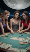 women playing monopoly on the moon. The are sitting cross legged and are topless. Large breast and tan.