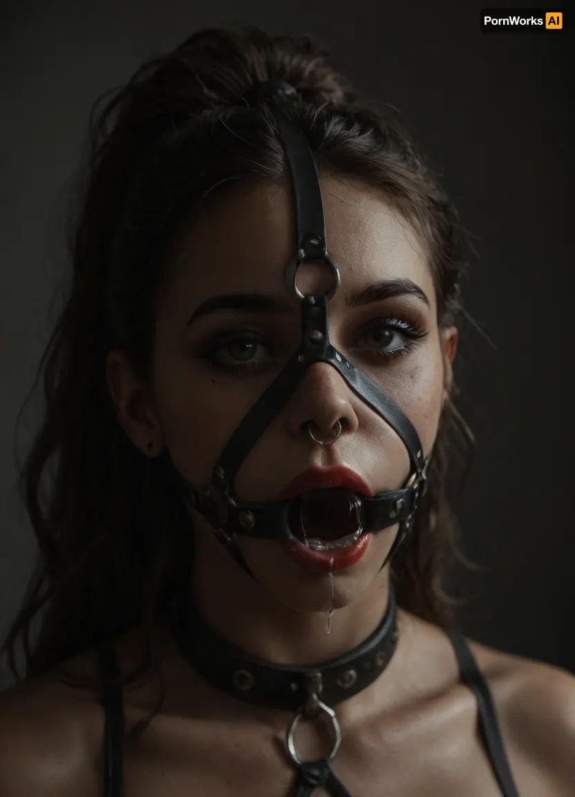 ((30 years old, Tipical italian girl, fit body, fake booobs, perfect cute face, curly very long brown hair in ponytail, brown eyes, light freckles, bimpo lips, skin pores, smooth skin, round ass, hips gap, oiled body)), ((heavy goth makeup, eyeshadow, eyeliner, mascara, red lipstick)), (slave collar), ((nose ring piercing, septum piercing:1.5)), (wearing a black thong), ((face harness gagged mouth:1.5)), ((drooling saliva from mouth, lot of saliva)), in a country apartment, harnessgag, <lora:add-detail-xl:1.3>, <lora:detailed_notrigger:1.2>, <lora:dark:.8>, <lora:harnessgag_xl-000003:1.3> ((30 years old, Tipical italian girl, fit body, fake booobs, perfect cute face, curly very long brown hair in ponytail, brown eyes, light freckles, bimpo lips, skin pores, smooth skin, round ass, hips gap, oiled body)), ((heavy goth makeup, eyeshadow, eyeliner, mascara, red lipstick)), (slave collar), ((nose ring piercing, septum piercing:1.5)), (wearing a black thong), ((face harness gagged mouth:1.5)), ((drooling saliva from mouth, lot of saliva)), in a country apartment, harnessgag, <lora:add-detail-xl:1.3>, <lora:detailed_notrigger:1.2>, <lora:dark:.8>, <lora:harnessgag_xl-000003:1.3>