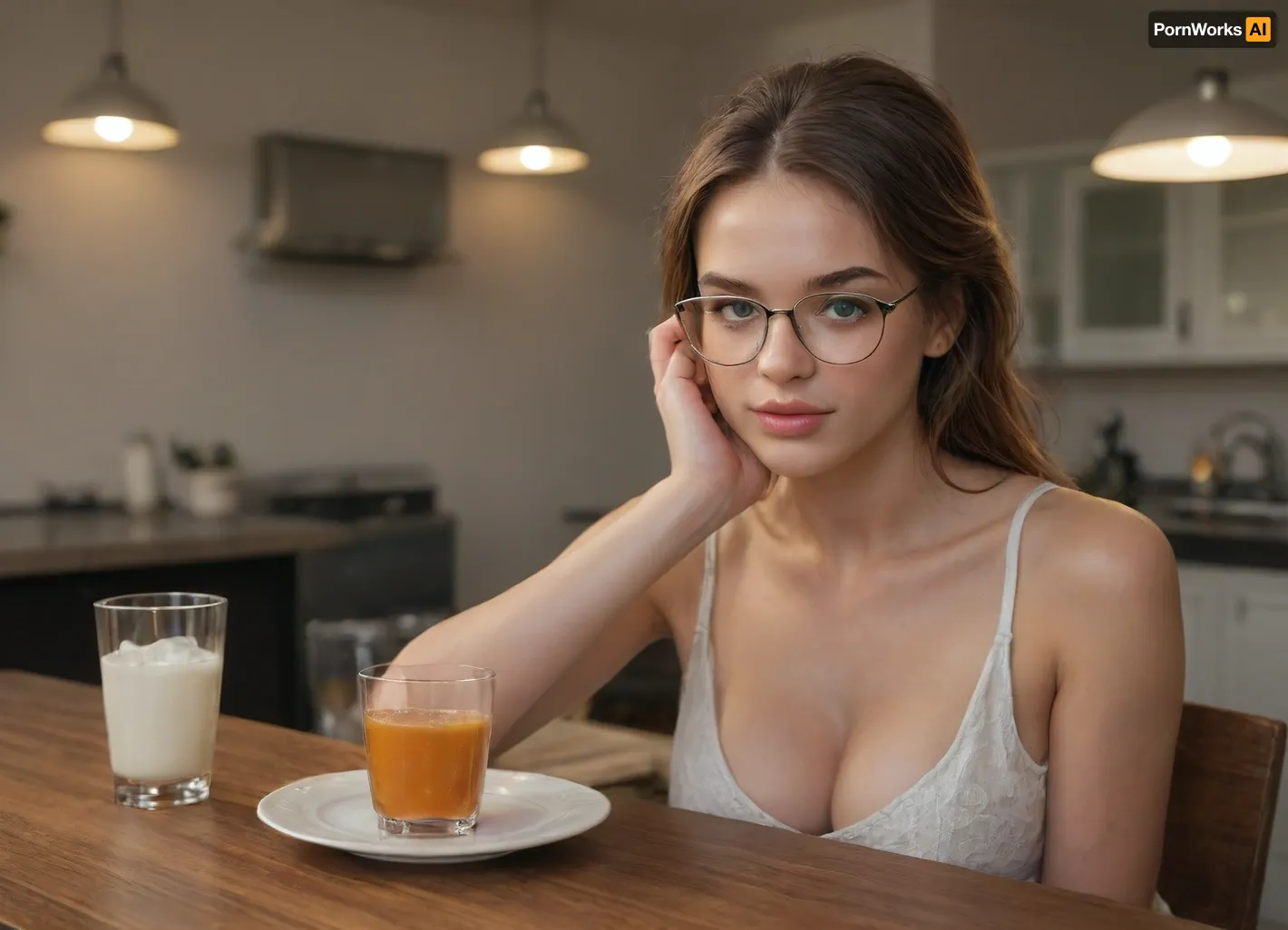 Two distinct beautiful woman, detailed faces, highly detailed, masterpiece, best quality, one woman is a 20 years old, (((futanari))), with large penis, 5'5", (165 cm), athletic yet curvaceous physique, full breasts, slim waist, toned legs, oval face with delicate features, high cheekbones, small nose, full lips, smooth porcelain skin with natural glow, large expressive dark brown almond eyes, long dark lashes, perfectly shaped eyebrows, youthful radiant appearance, glossy jet black hair with silky straight texture and slight wave, waist-length, multi-dimensional shine, face-framing layers, healthy volume and movement, the other woman is a 22 years old female wearing oversized tea glasses, 5'8", (174 cm), toned yet feminine physique, big breasts, long legs, heart-shaped face, straight nose, full lips with cupid’s bow, porcelain skin with subtle freckles, large almond emerald green eyes with golden flecks, auburn lashes, perfectly arched eyebrows matching hair color, luxurious natural copper/auburn hair with silky waves, thick volume, mid-back length, multi-dimensional color with golden highlights, (different faces:1.3), (unique appearances:1.3), (no face blending:1.3), (diverse facial features:1.2), (highly distinct women:1.2), at kitchen table, longsleave, heart black necklage, cumglass pint, cum in cup, used condom in cup, gokkun sharp details, realistic proportions, 8k, ultra-detailed, cinematic lighting
