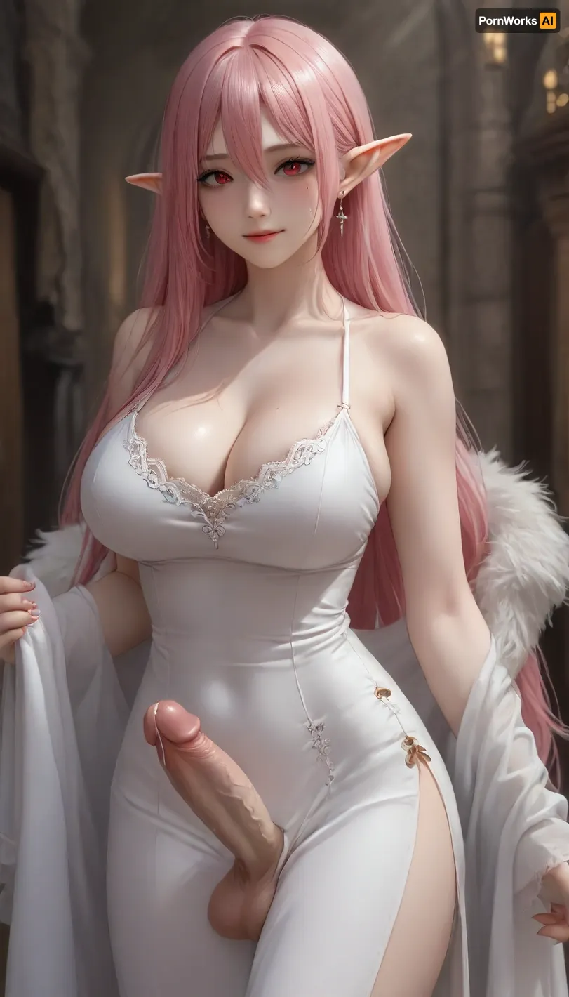 1girl, breasts, cleavage, dress, long hair, looking at viewer, smile, solo, pointy ears, blush, large breasts, red eyes, pink hair, very long hair, monster gir, mole, mole under eye, jewelry, hair between eyes, earrings, single earring, facial mark, side slit, slit pupils, tight dress, hobble skirt, tight clothes, dongtan dress, elf, ears, sousou, no, frieren, penis, futanari, erected penis, testicles, big testicles, penis under dress, the dress covers the penis, cum seeps through the fabric of the dress, <lora:milkers_v2:1.4>, <lora:sousouNoJayNL:.5>, <lora:209970_training_data:.5>