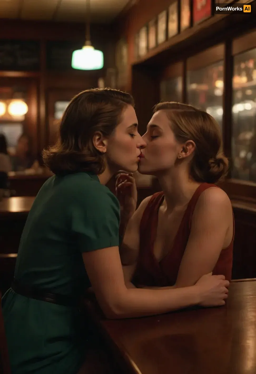 TWO LESBIAN FRIENDS kissing in a bar in the style of EDWARD HOPPER Nighthawks