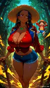 Pirate captain, female, 25 years old, Brazilian, short woman, chubby woman, monkey d luffy, very short black hair, tousled hair, straw hat with a red ribbon, large eyes, scar under her left eye, red button-up waistcoat, large tits, blue denim hot pants, sandals, downblouse, nipslip, <lora:RealDownblouseXL2:.8>, breasts, cutout, clothing, nipples, <lora:2BoutOvalSDXL2-000002:.8>