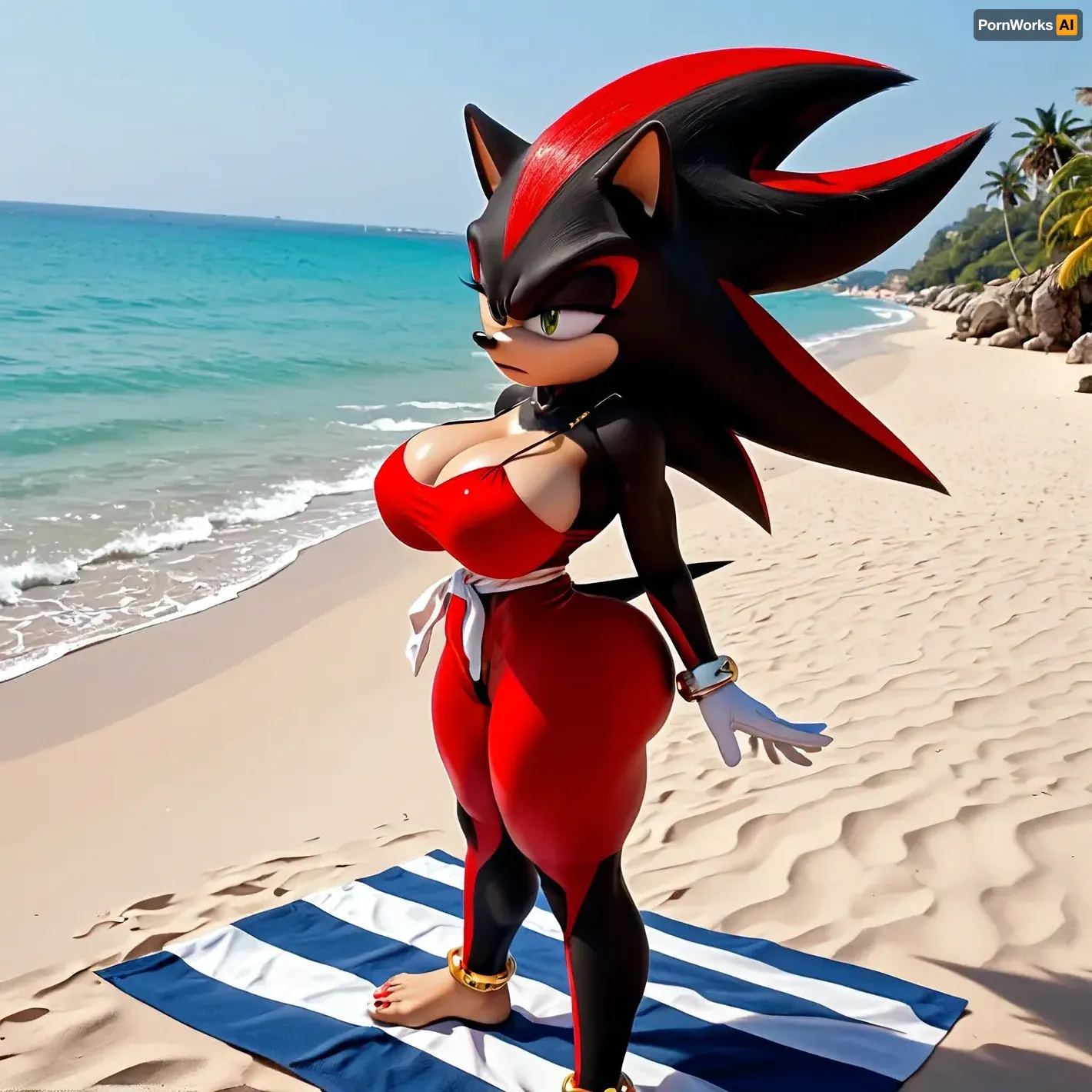 Genderbent Shadow the Hedgehog, 1girl, black fur, tan skin, massive round fake bimbo breasts, tanlines, hyper waist, huge fake bimbo ass, clothing extremely tight, shiny red and black thong bikini, on a sandy beach, red gloomy sunlight, arched back, pout, bimbo, clothing too tight, thick thighs, beach towel, front side view, dress around waist, very large pussy, (Anthro furry), (furry art), (Shadow the hedgehog), (Shadow the hedgehog Hair)