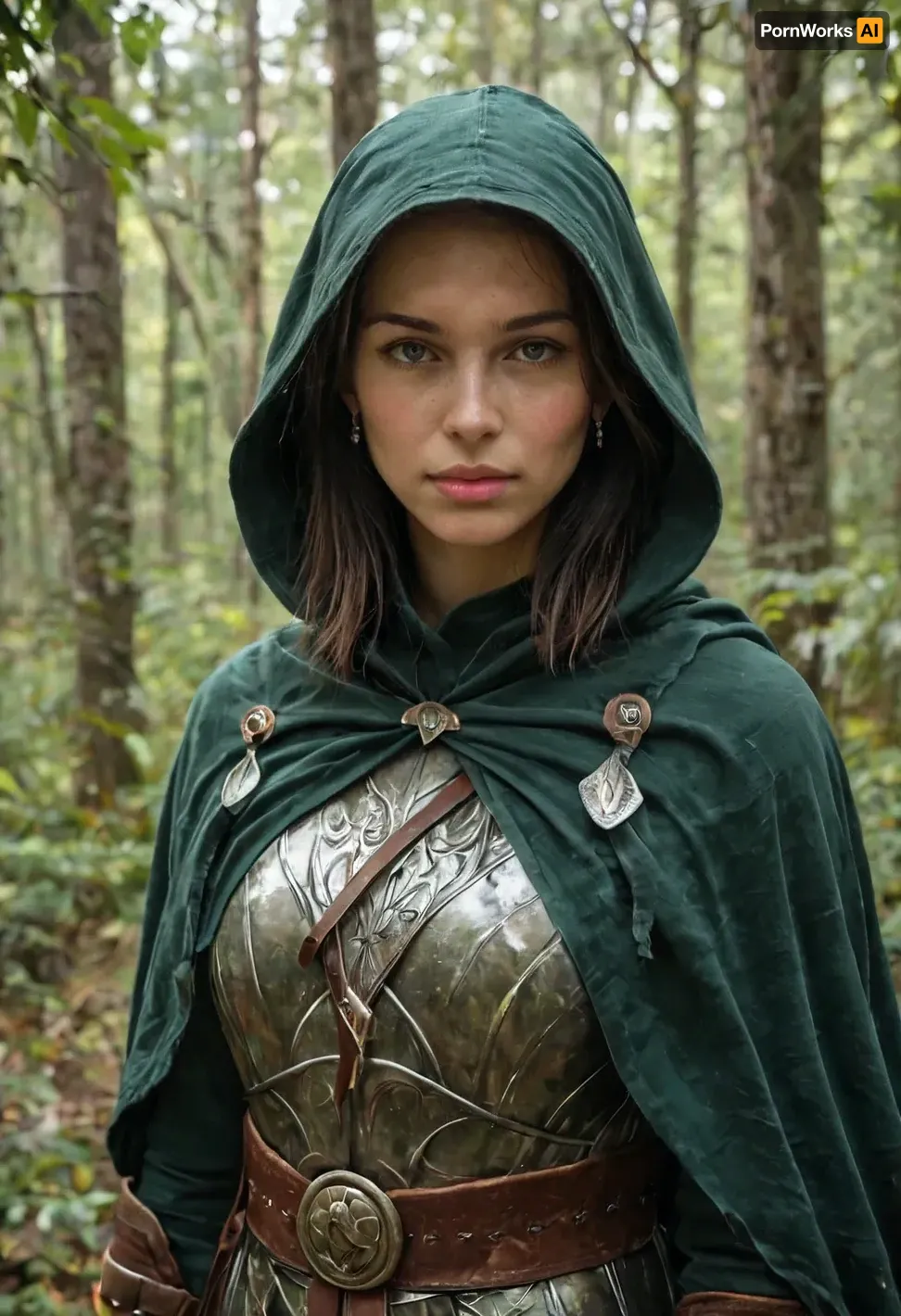 beautiful female ranger, Dungeons and Dragons style, standing in a dense forest with sunlight filtering through the leaves, wearing dark green leather armor with a hood and cloak, longbow in hand, quiver on her back, alert expression, forest mist and soft light beams, realistic foliage, cinematic lighting, photorealistic textures, ultra-detailed, 8k, RAW photo, natural tones, depth of field, realism, fantasy photography aesthetic