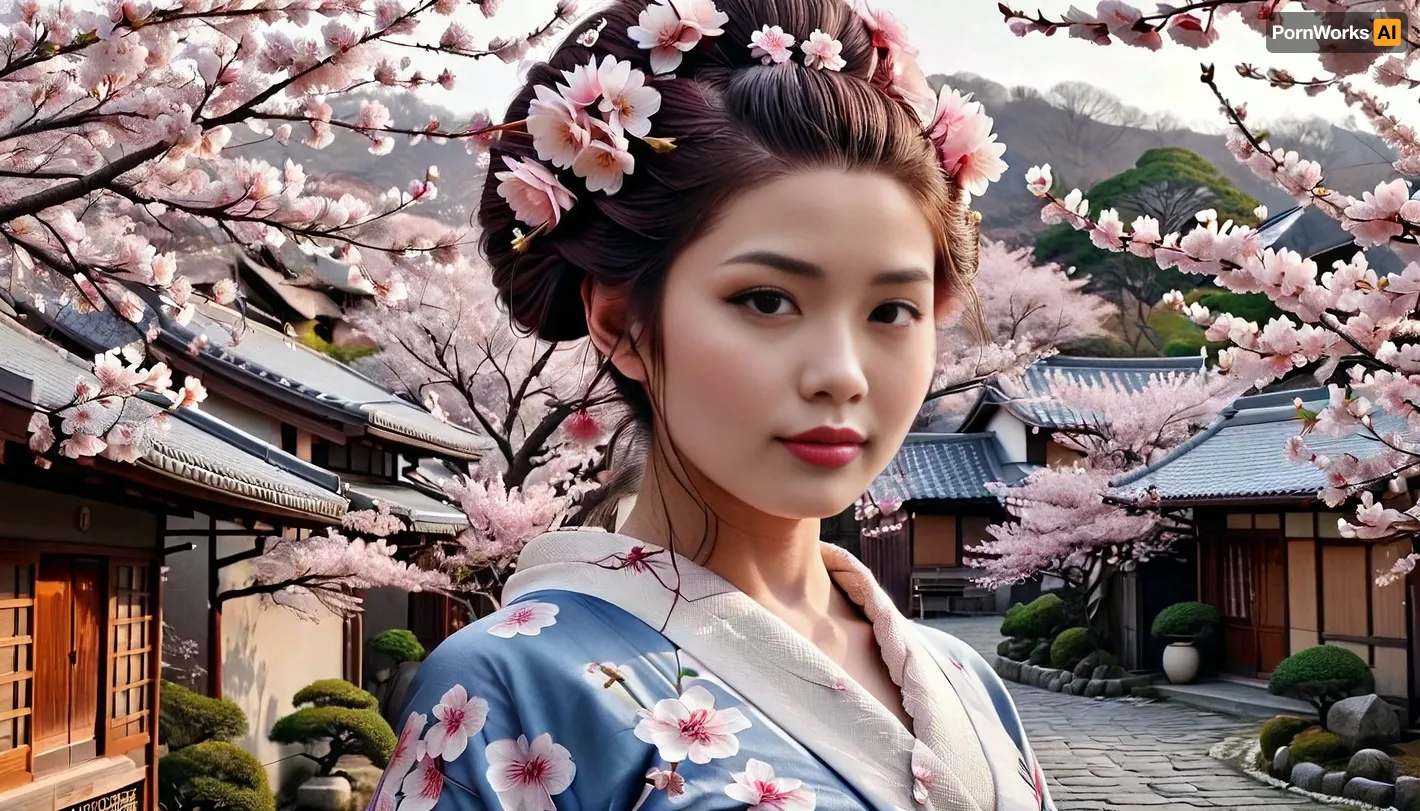 4K UHD ultra-detailed RAW photo, high detailed, 8k, photorealistic, Masterpiece, ((solo)), A beautiful young japanse woman sits under a cherry tree, DonMS4kur4XL. Cherry blossoms fall all around her, and lie thick on the geround. She wears a revealing blue silk kimono, with an ornate hairstyle and strong Geisha makeup, fflix-geisha. In the distant background behind the woman is a traditional Japanese village.