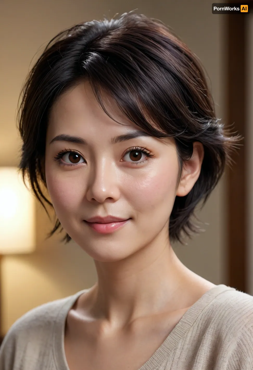 middle-aged Japanese woman, realistic face, short black hair, messy hair, dark brown eyes, under-eye bags, tired expression, neutral face, slight double chin, natural skin texture, detailed skin, lifelike, photorealistic, 8k, indoor lighting, (young), (beautiful), (makeup), (smile), (cute), 2D, anime, cartoon, high contrast, smooth skin middle-aged Japanese woman, realistic face, short black hair, messy hair, dark brown eyes, under-eye bags, tired expression, neutral face, slight double chin, natural skin texture, detailed skin, lifelike, photorealistic, 8k, indoor lighting, (young), (beautiful), (makeup), (smile), (cute), 2D, anime, cartoon, high contrast, smooth skin