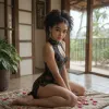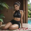 The scene takes place on the patio of a 5 star hotel on a warm tropical evening, A petite Africal lady with black hair styled with a pomy tail and fringe, She is relaxing with a glass of white white wine leaning back into a ratan lounger, She is wearing a tight black mini skirt with a black Cheongsam top decorated with large petals