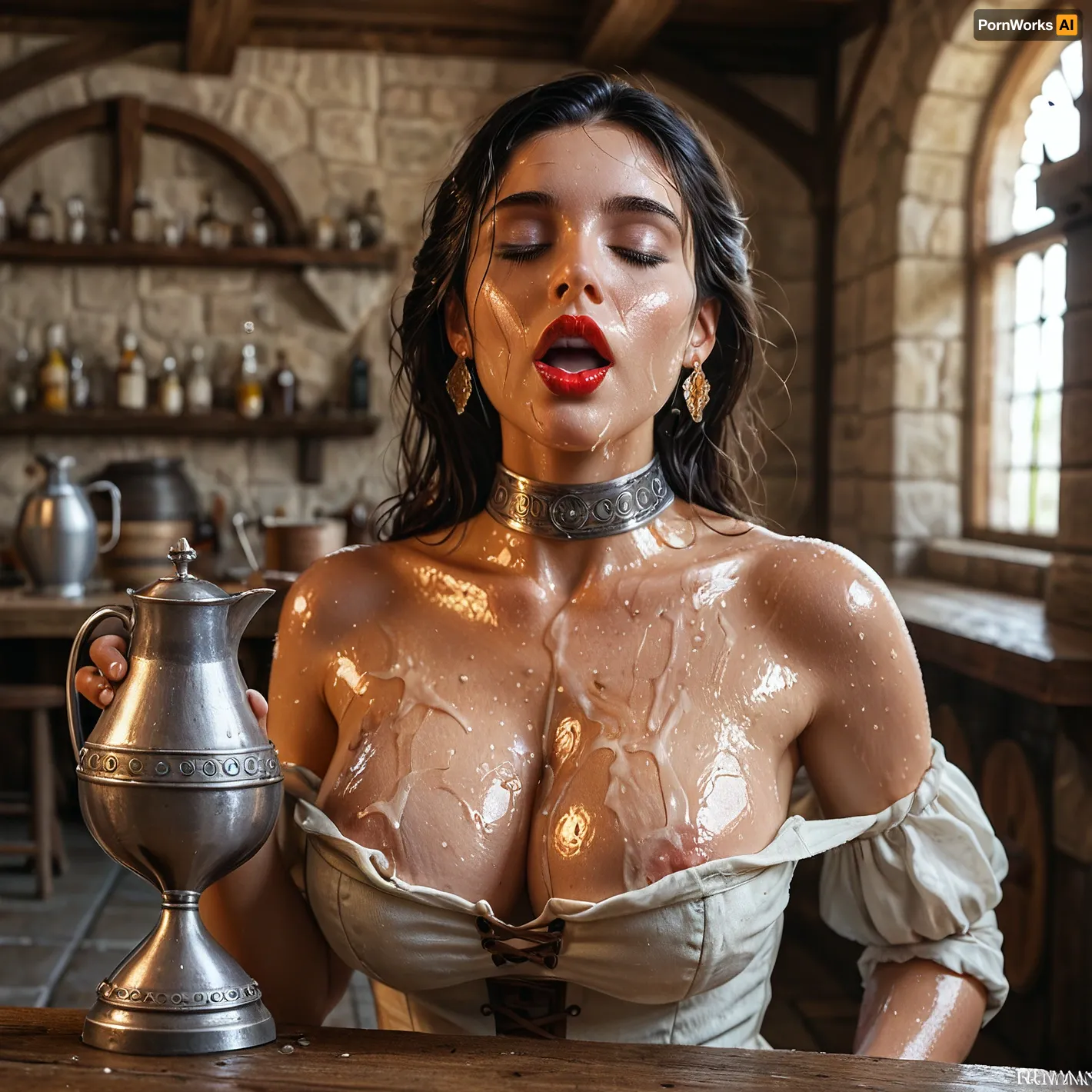 19 years old Italian girl, sienna skin tone, seductive and lewd look, inside a medieval tavern, standing by the counter, having mead poured over her breasts from a medieval jug tilted downwards while drinking, pouring mead over her body, mead flowing down her chest, mead overflowing, wet and oiled body, drops of mead on body, open mouth, closed eyes, looking up with head tilted up, full waist up view, alone, front view, voluptuous body, full red painted lips, very pretty, long straight black hair, round blue eyes, D size round tits, Roman nose, metallic choker around neck, wet body, detailed background, <lora:580159_training_data:1> 19 years old Italian girl, sienna skin tone, seductive and lewd look, inside a medieval tavern, standing by the counter, having mead poured over her breasts from a medieval jug tilted downwards while drinking, pouring mead over her body, mead flowing down her chest, mead overflowing, wet and oiled body, drops of mead on body, open mouth, closed eyes, looking up with head tilted up, full waist up view, alone, front view, voluptuous body, full red painted lips, very pretty, long straight black hair, round blue eyes, D size round tits, Roman nose, metallic choker around neck, wet body, detailed background, <lora:580159_training_data:1>