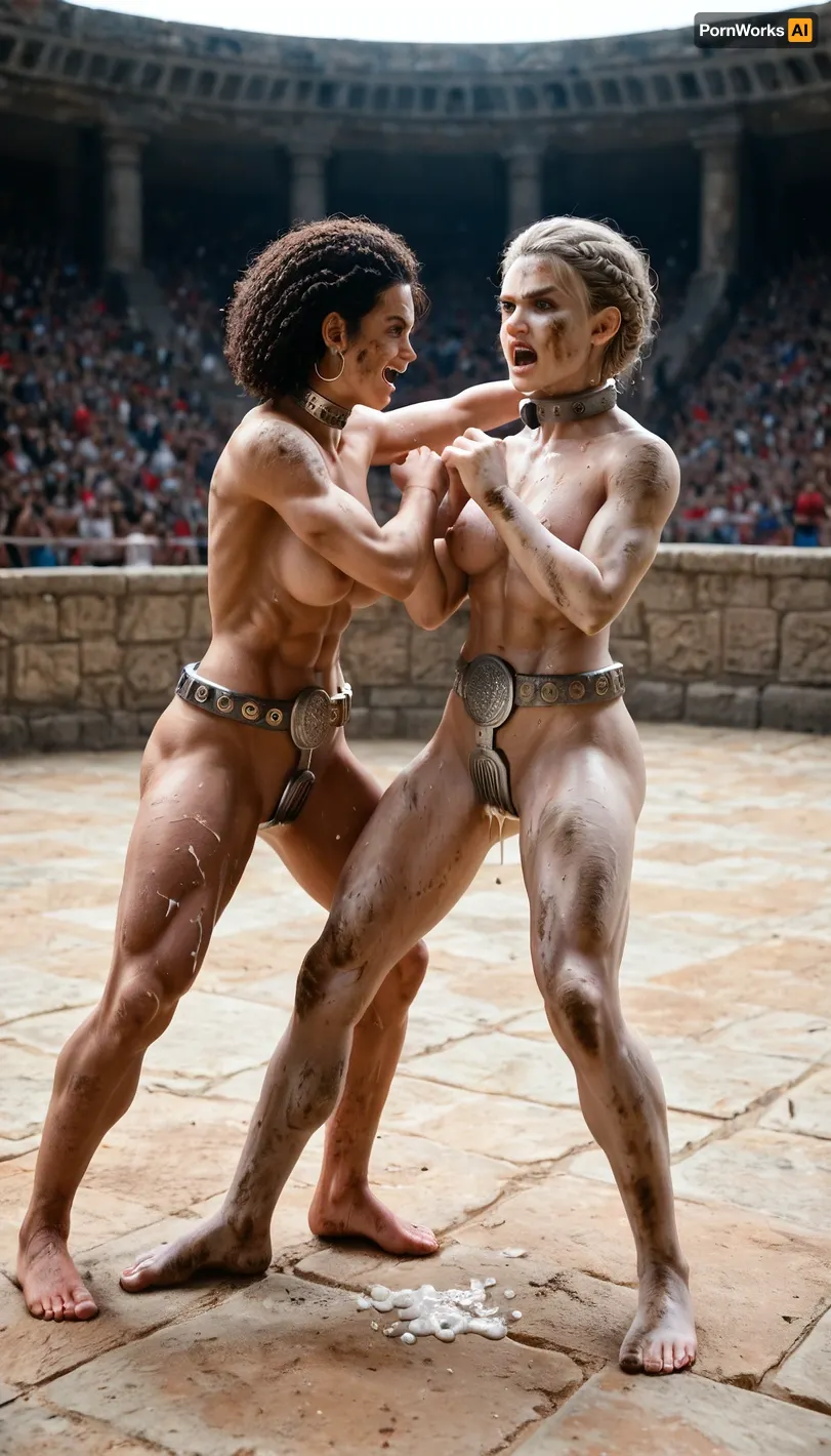 Two cute muscular gladiator girls, naked, (Dirty:.7), no make up, heavy steel collar, metal chastity belt, leather straps on torso, on hands and on legs, cum dripping, leaking cum, on Roman gladiator arena, stone walls, angry, (fight:1.2), fighting each other, beating each other, excited crowd Two cute muscular gladiator girls, naked, (Dirty:.7), no make up, heavy steel collar, metal chastity belt, leather straps on torso, on hands and on legs, cum dripping, leaking cum, on Roman gladiator arena, stone walls, angry, (fight:1.2), fighting each other, beating each other, excited crowd