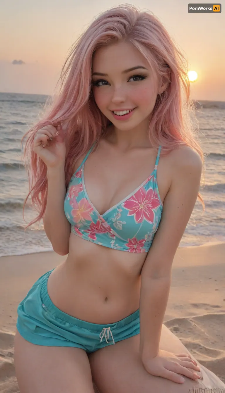 High-quality, b3ll3, 1girl, long, pink hair, eyes, breasts, belledlphn, facial freckles, deep blush, makeup, lewd teasing smile, small perky pointed boobs, small bubble butt, five fingers, perfect hands, perfect fingers, on a beach during sunset, (elaborate high-fashion swimwear with swim skirt), (naughtily teasing the viewer:2), <lora:Belle_Delphine:2>, <lora:BelleDelphine(belledlphn):2> High-quality, b3ll3, 1girl, long, pink hair, eyes, breasts, belledlphn, facial freckles, deep blush, makeup, lewd teasing smile, small perky pointed boobs, small bubble butt, five fingers, perfect hands, perfect fingers, on a beach during sunset, (elaborate high-fashion swimwear with swim skirt), (naughtily teasing the viewer:2), <lora:Belle_Delphine:2>, <lora:BelleDelphine(belledlphn):2>