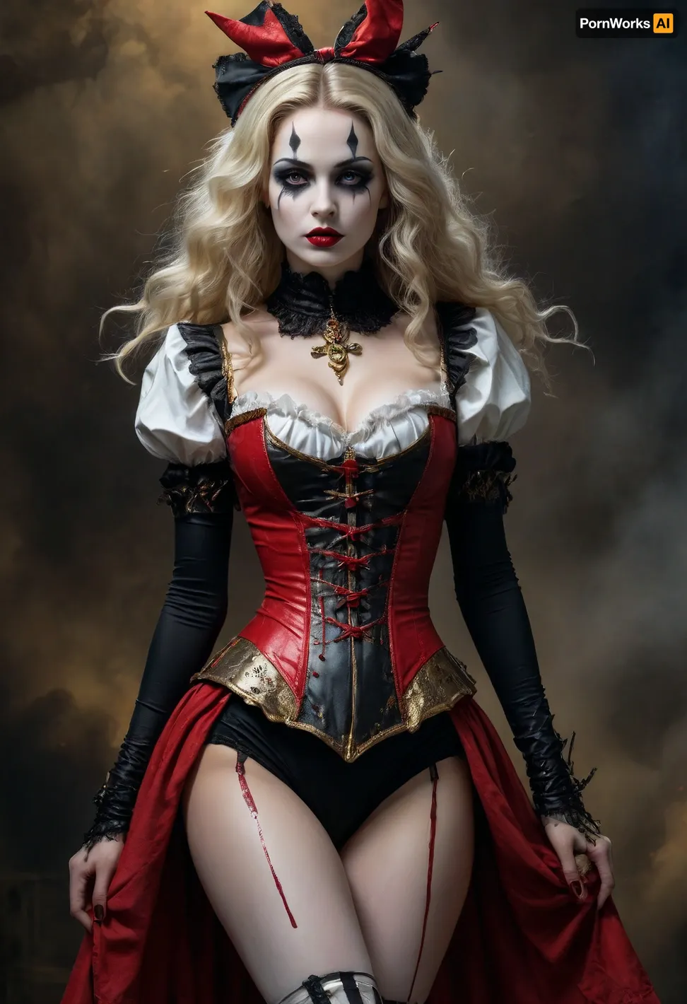 Tall, evil Alice in wonderland, full body shot, black, black gothic makeup, a beautiful female harlequin, tall, beautiful perfect figure, perfect tall legs, charming eyes, sad yet gracious face, dark background, fantasy art capturing the style of Aaron Horkey, Jeremy Mann and Luis Royo, body-focused composition from a low angle, alluring figure, dark fantasy, dynamic composition, white colors, red lipstick, warm hues, rendered in colorful ink flow, showcases acrylic calligraphy, watercolor techniques integrated seamlessly into a maximalist masterpiece, detailed with gouache fluidity, golden hour light