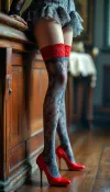 (Hosiery, thigh high, gray, lace pattern, red welt)