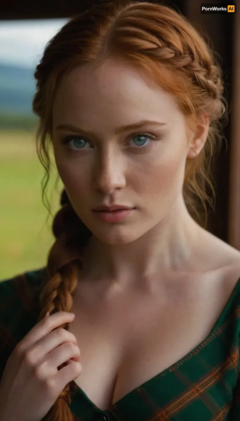 view from a wide distance, gorgeous sexy highland woman, 20 years, ginger hair braid, in a highlander plaid, Beautiful detailed face, (perfect blue eyes:1.1), (perfect skin:1.1), (perfect busty breasts:1.1), (perfect small pink nipples:1.1), (small areolas:1.1), (perfect vagina:1.1), (perfect body:1.1), (perfect hands:1.1), (perfect finger:1.1), (perfect fingernails:1.1), Photorealistic, RAW, analog, best quality, 8k, HD, DSLR, Fujifilm XT3, film grain, award winning, perfect eyes, green, eyes, perfecteyes, <lora:PerfectEyesXL:.8>