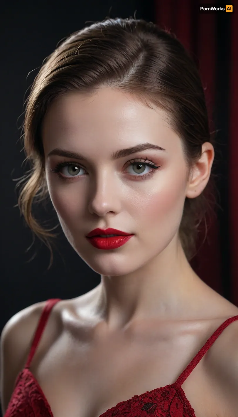 masterpiece, best quality, ultra-detailed photorealistic portrait of a stunning young woman, (flawless pale alabaster skin:1.1), (shockingly red lipstick), elegant shockingly red dress, minimalist composition, sharp focus on eyes and makeup details, textured dark charcoal grey studio background, subtle vignette, (dramatic cinematic lighting:1.2), strong key light illuminating the face, soft rim light creating separation, deep contrasting shadows, shot on Sony A7R IV with 85mm f/1.4 lens, shallow depth of field, bokeh background, professional color grading, RAW photo quality, 8k UHD, insanely detailed, intricate details, award-winning photography, striking visual contrast, elegant