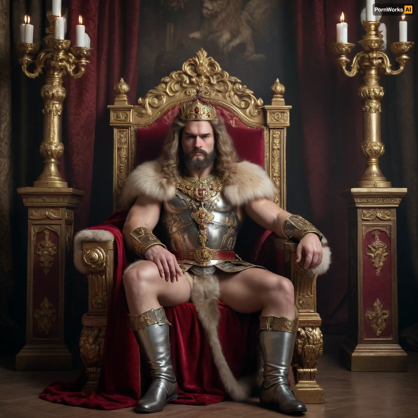 Russian Tsar, muscular body, royal clothing, sitting on a throne, sword in his left hand, scepter in his right, stern look, gloomy surroundings, two lions Russian Tsar, muscular body, royal clothing, sitting on a throne, sword in his left hand, scepter in his right, stern look, gloomy surroundings, two lions