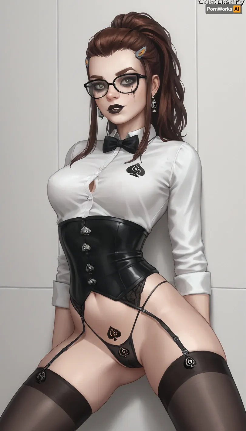 Brigitte Lindholm, glamorous goth makeup, black lipstick, slim body, tiny-waist, pointy breasts, posing sexy, ((black waist cincher, spades branded thong, black stockings, secretary glasses, strict glasses)), garterbelt, garters, legs apart, white wall, white painted wall, clean wall, plain wall, clear wall
