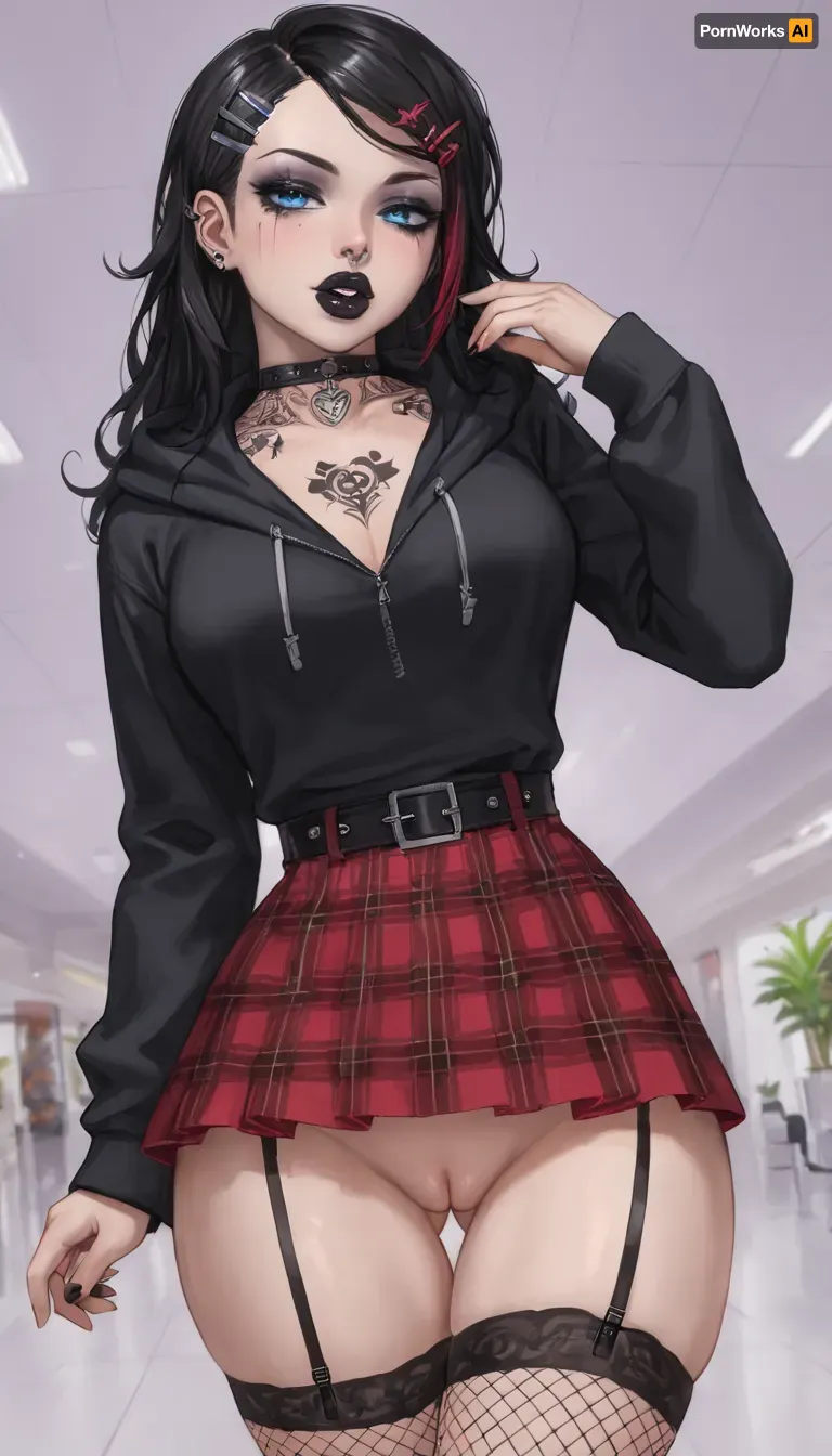 Tight asshole, pervy cute frisky emo girl, covered in tattoos, lots of tattoos, extremely horny, very attractive slutty hottie giving viewer peek of her tiny incredibly tight pussy, (huge anal plug:1), looking back at viewer with adorable extreme lewdness, beautiful face like a supermodel, glamorous goth makeup, black lipstick, (full thick lips:1.1), beautiful, gorgeous, perfect face, small cute nose, (blue perfect eyes), (large seductive eyes:1.3), (incredibly sexy physique:1.4), narrow shoulders and chest, narrow waist, perfect round ass, thigh gap, naturally busty, long straight black hair with highlights, (hair clip:1.4), (black hoodie:1.3), (red plaid skirt), (garter belt, fishnet stockings), (showing pussy:1.2), mall, TattooVariations, 3m0, Punk, G1rl, portrait, makeup, glowing, punk, 1girl, emo, girl, <lora:lora-sdxl-perfect-eyes:2>, <lora:TattooVariations:1.9>, <lora:Emo_Punk_Girl:1.2>, <lora:2010s_Emo_Style_XL:.6>, <lora:Buttplug__SDXL:1.8>