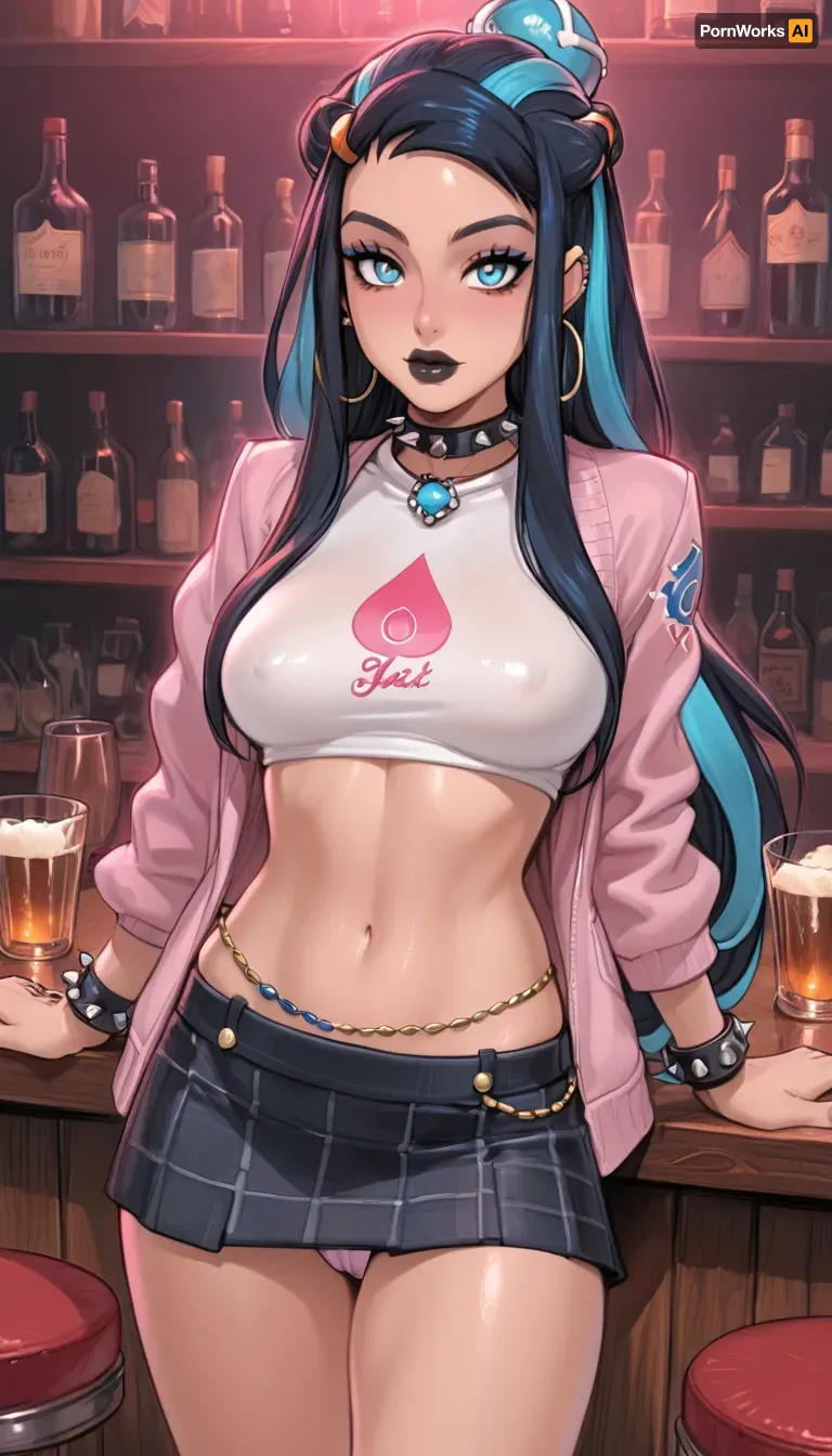(reiq style), (nessa from pokemon:1.6), 18 years old girl, covered in tattoos, lots of tattoos, pink crop top jacket, white micro bra, queen of spades branded panties, short plaid skirt, (camel toe), detailed blue eyes, (glamorous goth makeup, black lipstick), spiked choker, spiked bracelets, long eyelashes, (high cheekbones:1.4), perfect nose, (full plump lips:1.2), (bar country:1.6), curvy, 1 girl, beautiful eyes, Melkor Mancin artstyle, score_9, score_8_up, score_7_up, (genshin, impact\), TattooVariations, 3m0, Punk, G1rl, girl, portrait, makeup, glowing, punk, <lora:cartoon_stickers_xl_v1:.8>, <lora:ratatatat74-000050:1.3>, <lora:DetailedEyes_V3:2>, <lora:TattooVariations:1.9>, <lora:Emo_Punk_Girl:1.2> (reiq style), (nessa from pokemon:1.6), 18 years old girl, covered in tattoos, lots of tattoos, pink crop top jacket, white micro bra, queen of spades branded panties, short plaid skirt, (camel toe), detailed blue eyes, (glamorous goth makeup, black lipstick), spiked choker, spiked bracelets, long eyelashes, (high cheekbones:1.4), perfect nose, (full plump lips:1.2), (bar country:1.6), curvy, 1 girl, beautiful eyes, Melkor Mancin artstyle, score_9, score_8_up, score_7_up, (genshin, impact\), TattooVariations, 3m0, Punk, G1rl, girl, portrait, makeup, glowing, punk, <lora:cartoon_stickers_xl_v1:.8>, <lora:ratatatat74-000050:1.3>, <lora:DetailedEyes_V3:2>, <lora:TattooVariations:1.9>, <lora:Emo_Punk_Girl:1.2>
