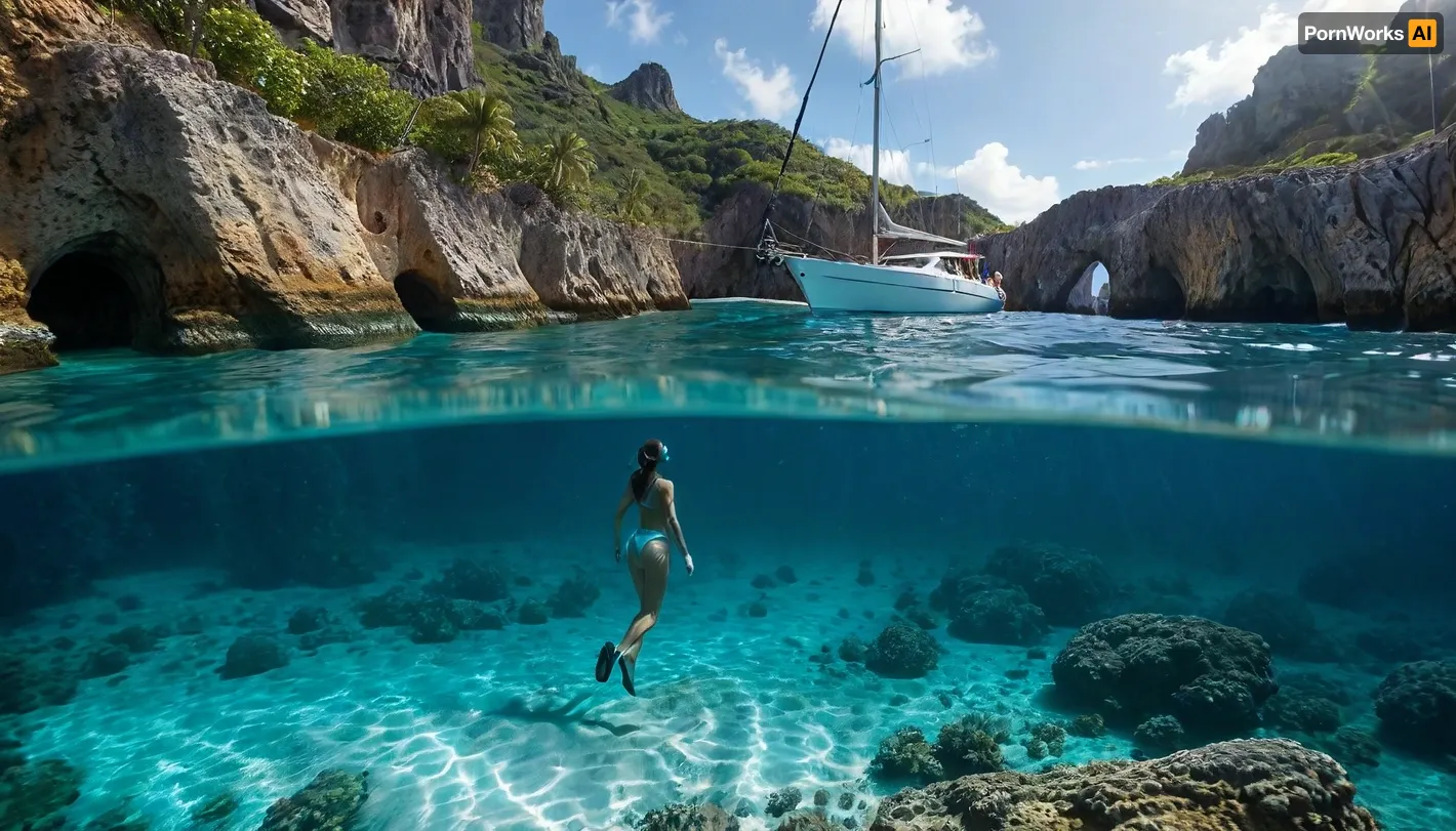 full body view of stunning slender woman, snorkeling against the backdrop of a noble sailing yacht in turquoise water. texture, photorealistic, The yacht is anchored in front of a large Caribbean cave, sunlight_str1, underwater, grotto, cave, sandy, sea, floor, reef, <lora:sunlight_str1-SDXL_v1-dim64-steps1691:1.2>, <lora:MJ52:.3>, <lora:Underwater_Environment_v01-000002:.9>, <lora:Splitshot:.4> full body view of stunning slender woman, snorkeling against the backdrop of a noble sailing yacht in turquoise water. texture, photorealistic, The yacht is anchored in front of a large Caribbean cave, sunlight_str1, underwater, grotto, cave, sandy, sea, floor, reef, <lora:sunlight_str1-SDXL_v1-dim64-steps1691:1.2>, <lora:MJ52:.3>, <lora:Underwater_Environment_v01-000002:.9>, <lora:Splitshot:.4>