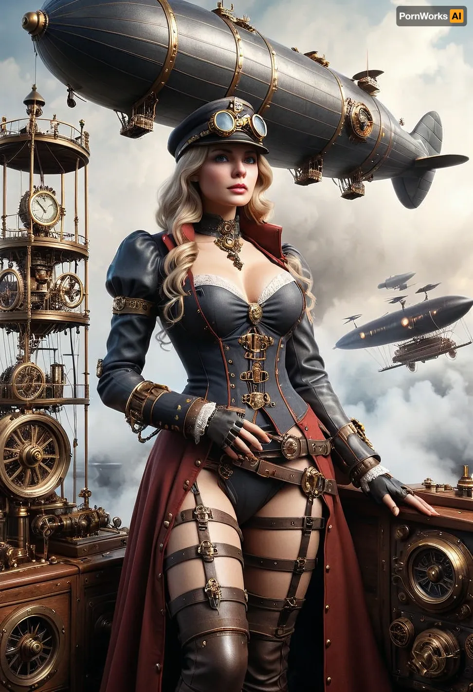 Steampunk, (1girl), A wide shot from outside of an airship into an extremely detailed control center on an antique airship, ultra detailed, fine details, high resolution, a solo blonde female captain on the deck of an airship, wears unique detailed Captain uniform, lace black stockings, red stiletto heels, medium breasts, lace bra, (crotchless:1.5), dashboard, gauges, steam engine and gears in the background, sexy, blue eyes, red cape, gloves, gold patterned necklace, cylindrical hat, goggles, bracelets, (vintage airships battle in the background:1.5), steampunk style grime, top view of earth landscape, sunset, gold-rimmed clouds, translucent in the sun, flat, anchespaceroom, cloudy, smoke, atmospheric, clouds, fog, steampunknoireai, mad-mecharm, <lora:Cloudy_Style:1>, <lora:SteamPunkNoireAIp:.7>, <lora:Gearbound_Mechanical_Arm_SDXL:.8>, <lora:Hell_Constantine_2005_-_Anime:1.6>, <lora:detailed_notrigger:2> Steampunk, (1girl), A wide shot from outside of an airship into an extremely detailed control center on an antique airship, ultra detailed, fine details, high resolution, a solo blonde female captain on the deck of an airship, wears unique detailed Captain uniform, lace black stockings, red stiletto heels, medium breasts, lace bra, (crotchless:1.5), dashboard, gauges, steam engine and gears in the background, sexy, blue eyes, red cape, gloves, gold patterned necklace, cylindrical hat, goggles, bracelets, (vintage airships battle in the background:1.5), steampunk style grime, top view of earth landscape, sunset, gold-rimmed clouds, translucent in the sun, flat, anchespaceroom, cloudy, smoke, atmospheric, clouds, fog, steampunknoireai, mad-mecharm, <lora:Cloudy_Style:1>, <lora:SteamPunkNoireAIp:.7>, <lora:Gearbound_Mechanical_Arm_SDXL:.8>, <lora:Hell_Constantine_2005_-_Anime:1.6>, <lora:detailed_notrigger:2>