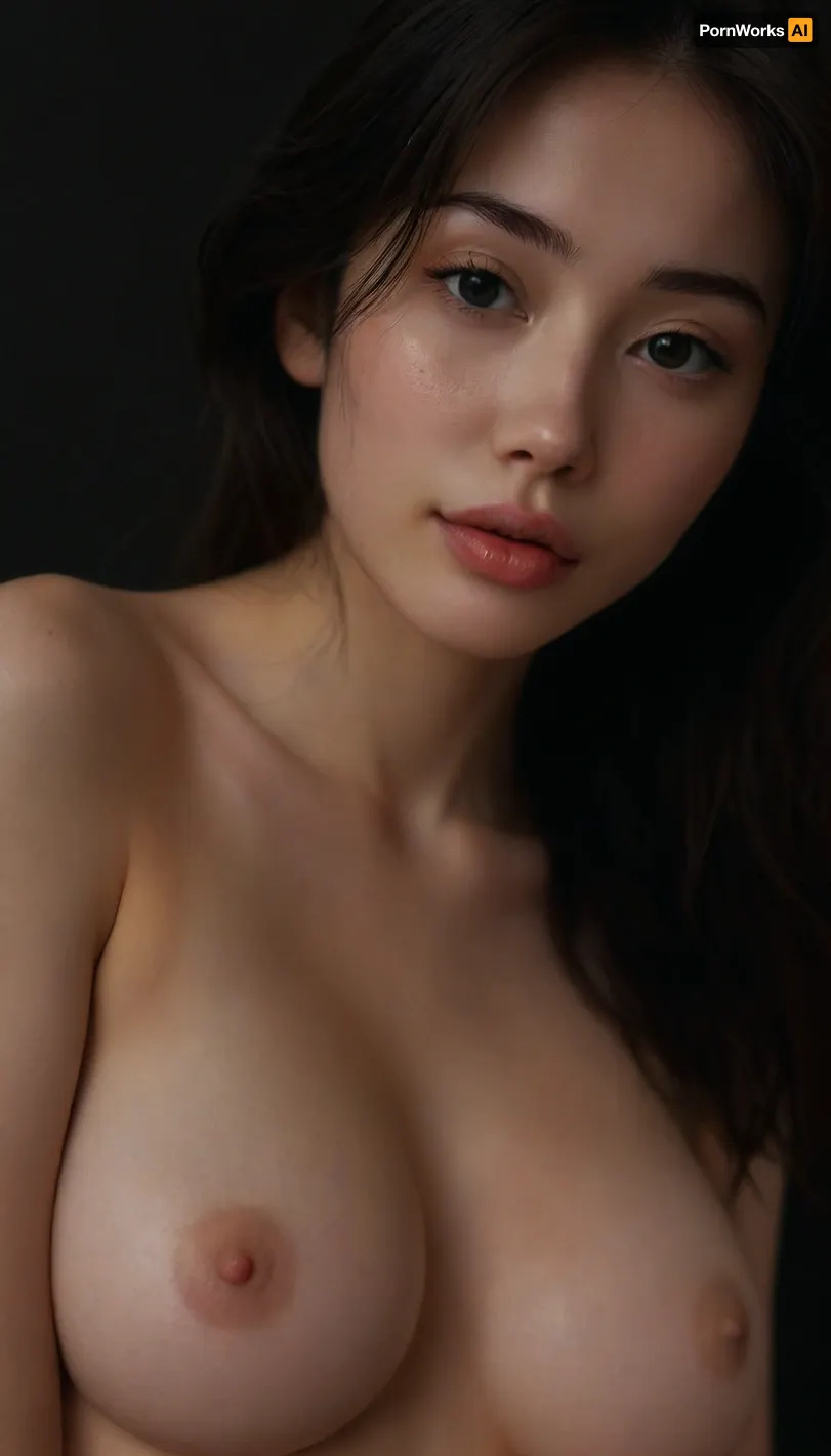 ziprealism, (24yo woman, sensual intimate esthetic, adorable Japanese woman, bashful pose, soft smile:1.8), (f/2.8, shallow depth of field), (medium full shot, Dutch Angles, lips focus:1.2), (glossy black hair, dark full eyebrows:1.4), (loosely falling hair, loose hair obscuring face, loose hair hiding eyes:1.6), (full lips, soft pillowed lips, moist glossy lips, lips parted, hot breath, natural skin texture, flawless pale skin:1.4), (large teardrop breasts, pale nipples, slender waist:1.8), igbaddie, (dark scene, chiaroscuro, black background:1.6), <lora:style_lora_realis:.4>, <lora:igbaddie-XL:.4>, <lora:zavy-cntrst-sdxl:1.2>