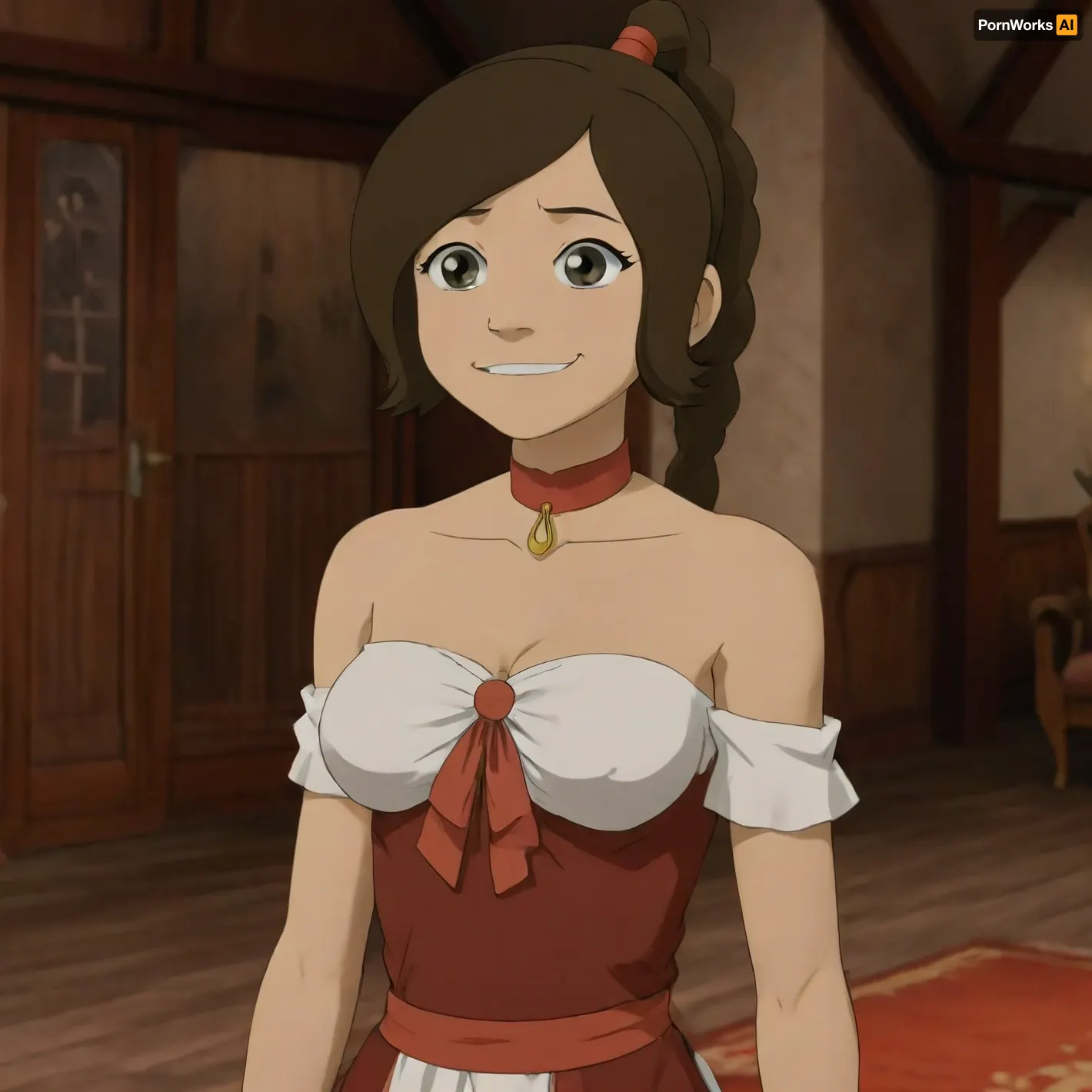 anime illustration, cinematic lighting, in luxury house, 1girl, solo, brown hair, medium breasts, smile, dedicated maid dress, bare shoulder, apron, nsfw, tylee, <lora:ClearHand-V2:1>, <lora:Tylee-SDXL:.75>, breasts, cutout, clothing, nipples, <lora:2BoutOvalSDXL2-000002:.5>