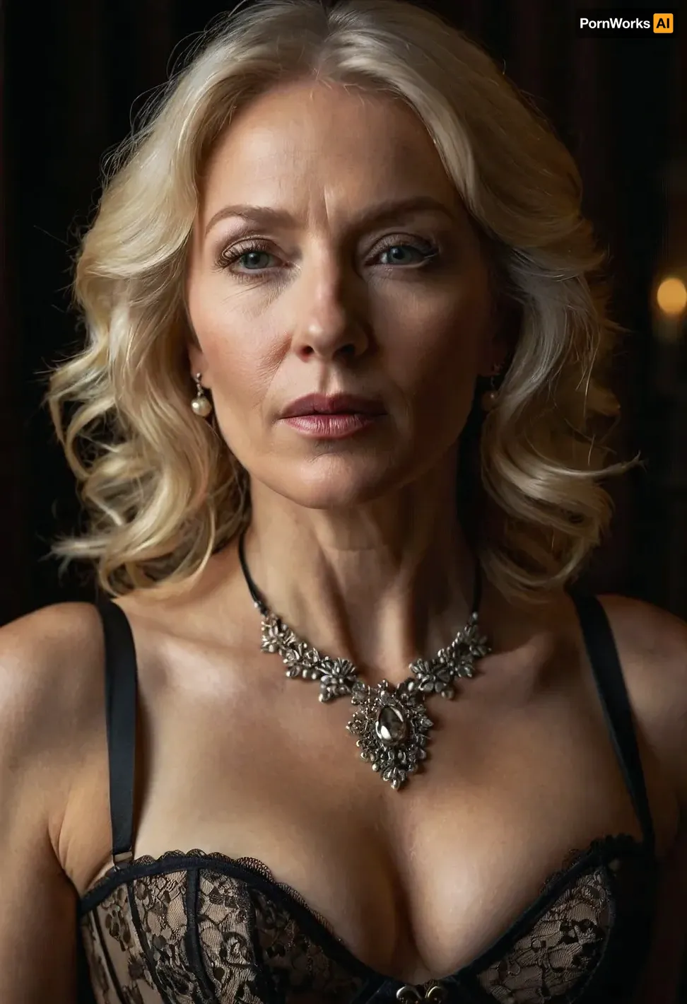 a vivid, accurate description of a hyper-realistic portrait of a mature woman who exudes confidence. Her platinum blonde hair cascades past her shoulders against a dark background. Inspired by Rembrandt's chiaroscuro, the lighting is meticulous and eye-catching. The editor's refined finish and ethereal glamour evoke timeless standards of beauty reminiscent of the Renaissance. Focus on the small to medium-sized breasts, which are accentuated when she kneels, revealing their full splendour. Her eyes are closed in ecstatic abandon, her mouth open in a silent scream of pleasure, as if she has been transported to a world of unbridled ecstasy. The dark make-up only adds to the attractiveness of her features, irresistibly drawing the viewer's eye to her face. Around her neck, a delicate and intricate lace corset adds a touch of sophisticated sensuality, while the BDSM necklace with a shiny toric joint is a powerful symbol of her unashamed submission. The overall effect is one of raw, unbridled desire, as if this woman has completely let go in the moment, surrendering to pure, unadulterated pleasure and the joy of being alive