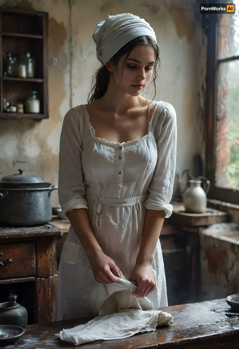 18 century, the young 18-year-old solo girl is working as helper in a castle kitchen, dressed in a long simple cotton dress and a headscarf, she is ultra sweaty, worn out, submissive, shy, ultra-flat-chested, exposing hard long erected nipples, (detailed perfect nipples in focus), joyful anticipation, looking to the viewer, (wet sweaty panties:1.6), FRESHIDEAS, Real, Photography, 2#, Black, and, white, art, black, shading, charcoal, toned, brutal, dark, b/w, color, scheme, <lora:FRESHIDEAS Real Photography 2#:.6>, <lora:Black and white art.V1:.1>, <lora:MJ52:.4>, <lora:add-detail-xl:.9> 18 century, the young 18-year-old solo girl is working as helper in a castle kitchen, dressed in a long simple cotton dress and a headscarf, she is ultra sweaty, worn out, submissive, shy, ultra-flat-chested, exposing hard long erected nipples, (detailed perfect nipples in focus), joyful anticipation, looking to the viewer, (wet sweaty panties:1.6), FRESHIDEAS, Real, Photography, 2#, Black, and, white, art, black, shading, charcoal, toned, brutal, dark, b/w, color, scheme, <lora:FRESHIDEAS Real Photography 2#:.6>, <lora:Black and white art.V1:.1>, <lora:MJ52:.4>, <lora:add-detail-xl:.9>